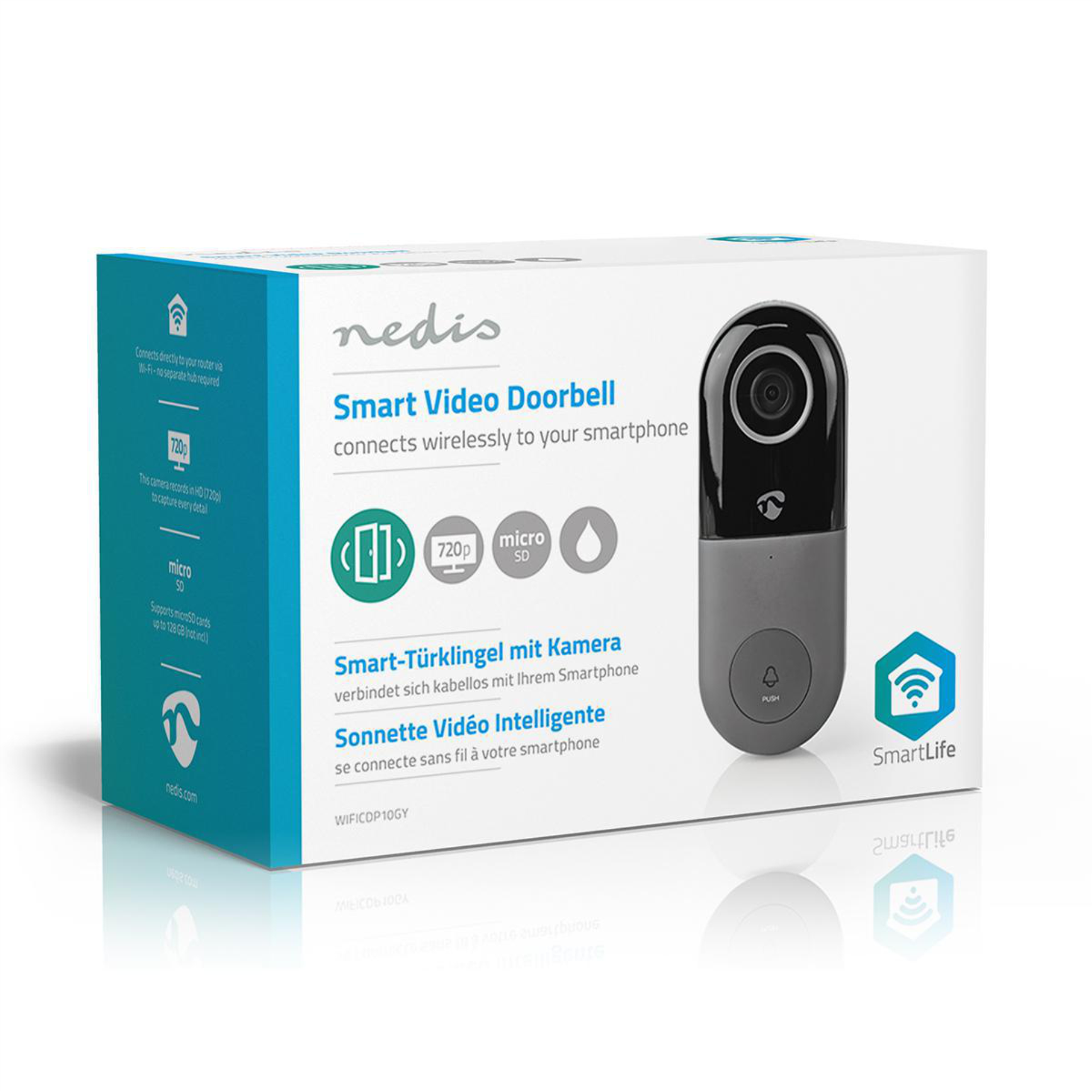 • Stuurt pushberichten naar je smartphone als er iemand de voordeur nadert (bewegingsdetectie) of aanbelt • Bewegingsdetectie kan ook worden uitgezet (bijv. als de voordeur direct aan de straat grenst) • 2-zijdige communicatie om met je bezoeker te spreken, waar je zelf ook bent • HD-opnames (720p) en digitaal inzoomen op je smartphone voor een gedetailleerd beeld • Werkt op 8 - 24 V AC – gebruik de bedrading van je bestaande, bedrade deurbel • Opnames worden opgeslagen op een microSD-kaart tot 128 GB (niet inbegrepen) – kijk terug wat er is gebeurd • Incl. hoekbeugel voor een optimale kijkhoek • Geïntegreerd in de Nedis® SmartLife-app • Uit te breiden met de draadloze deurbelontvanger (WIFICDPC10BK – niet inbegrepen), zodat je de deurbel hoort als je zelf thuis bent, ongeacht waar je telefoon ligt