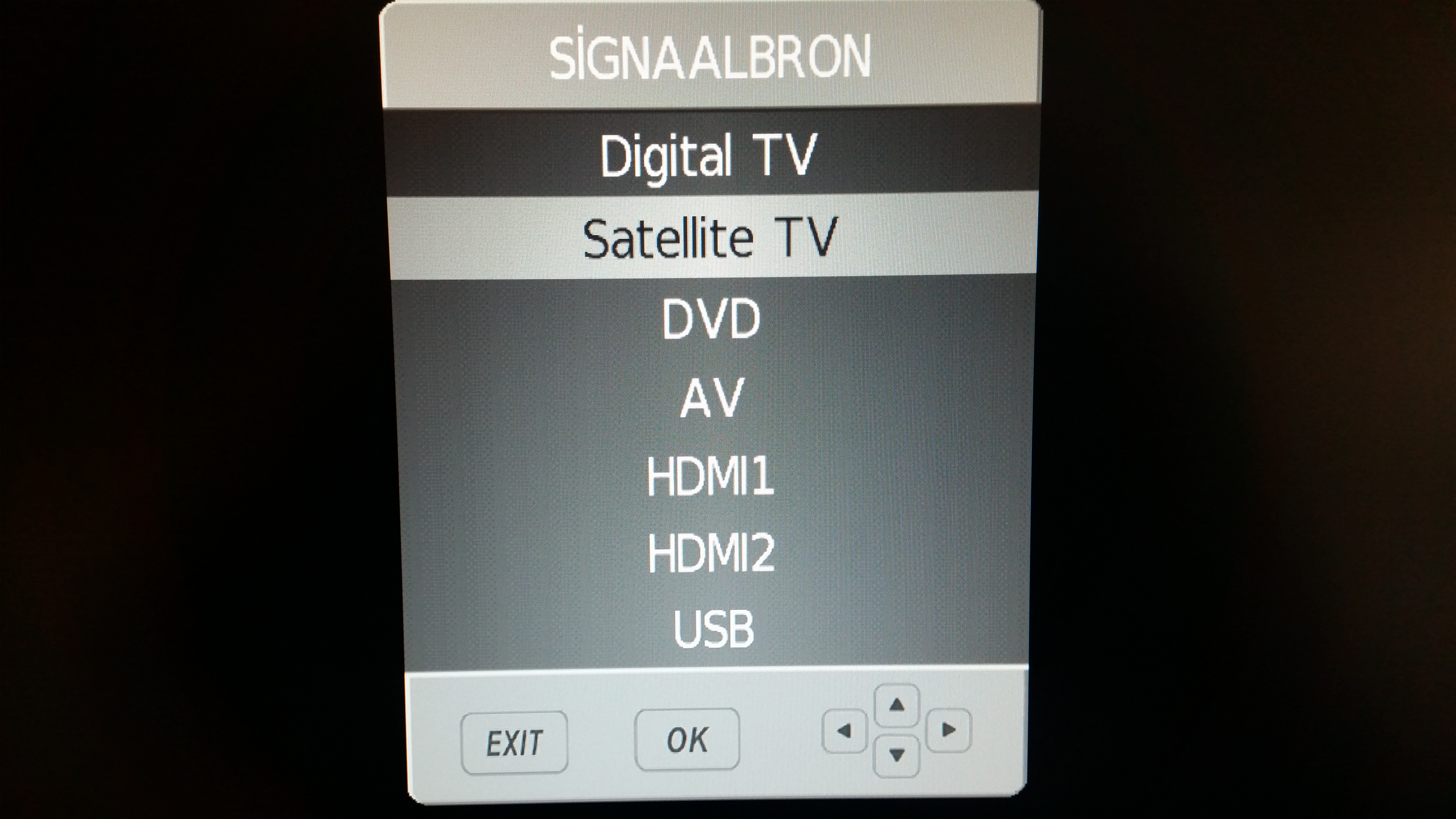 Zet de televisie aan op satelliet TV signaalbron (dit kan met de toets SOURCE, daarna met pijl ernaar toe en OK om te selecteren):