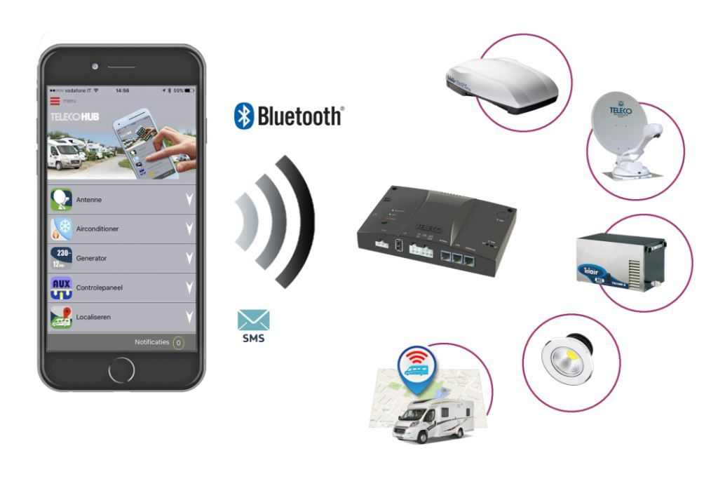 Teleco HUB is een handige interface om uw camper of uw caravan met een eenvoudige app op uw smartphone op afstand te bedienen. U bedient de airco, schotelantenne, verlichting en meer eenvoudig op afstand. Teleco HUB werkt dichtbij via Bluetooth, bent u verder weg dan via SMS. Voorwaarde is dat u een micro-simkaart (pre-paid of abonnement) in de Teleco HUB box steekt.