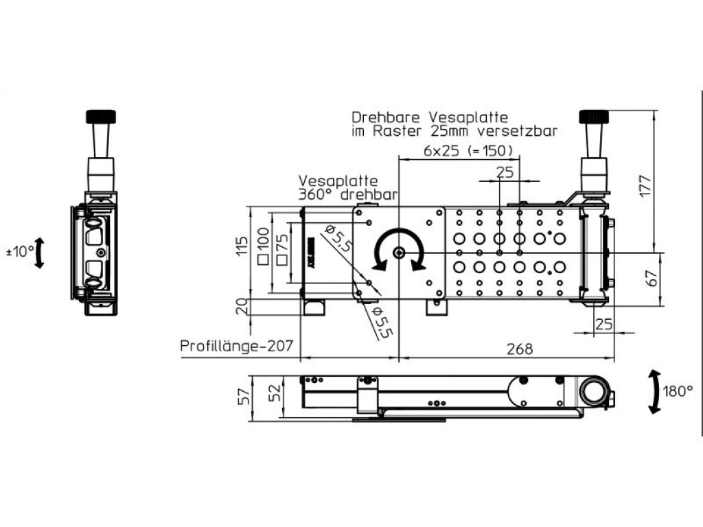 -VESA-plaat kan worden verplaatst in een raster van 25 mm