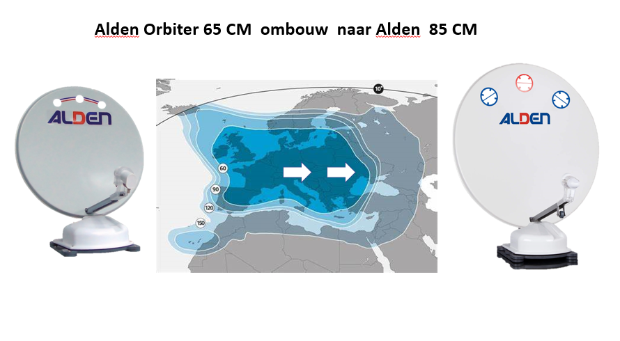 Vaak vindt u op importcampers uit Duitsland en Frankrijk een schotel met een diameter van 65cm. In deze landen worden andere satelietten gebruikt, waarvoor een kleinere diameter voldoende is. Canal Digitaal maakt echter gebruik van de Astra 3 (23,5) satelliet, hiervoor is de 65cm wel geschikt voor de ons omringende landen. Ten zuiden van Barcelona zal de signaalsterkte sterk afnemen en wegvallen. Wilt u verder zuidelijker gaan dan heeft u met de 85cm schotel veel verder bereik. Bovendien zal het beeld bij regen minder snel wegvallen. Voor het uiterste zuiden van Spanje en Portugal en voor Scandinavië biedt dit geen uitkomst. Mochten dit uw reisbestemmingen zijn dan bevelen wij de Bente Alden 68cm skew aan.