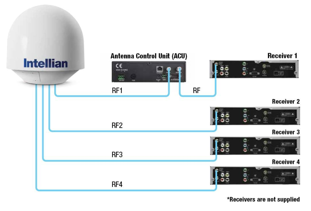 Dankzij de vier uitgangen die op de schotel zitten kunt u meerdere ontvangers en tv's aansluiten. Met de MIM (Multi-Satellite Interface Module) kunt u een hoofdontvanger selecteren welke de schotel kan aan sturen.