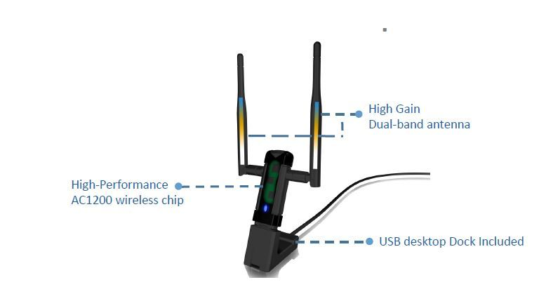 De Alfa Network AWUS036AC USB WiFi-ontvanger haalt snelheden tot 867 Mbps. U sluit de AWUS036AC aan op de USB-poort van uw laptop of pc. De ontvanger werkt zowel op de 2,4 GHz als 5,0 GHz frequentie. Door 2 krachtige 5 dBi afneembare dualband antennes is het bereik van deze Alfa Network USB WiFi-ontvanger uitstekend.