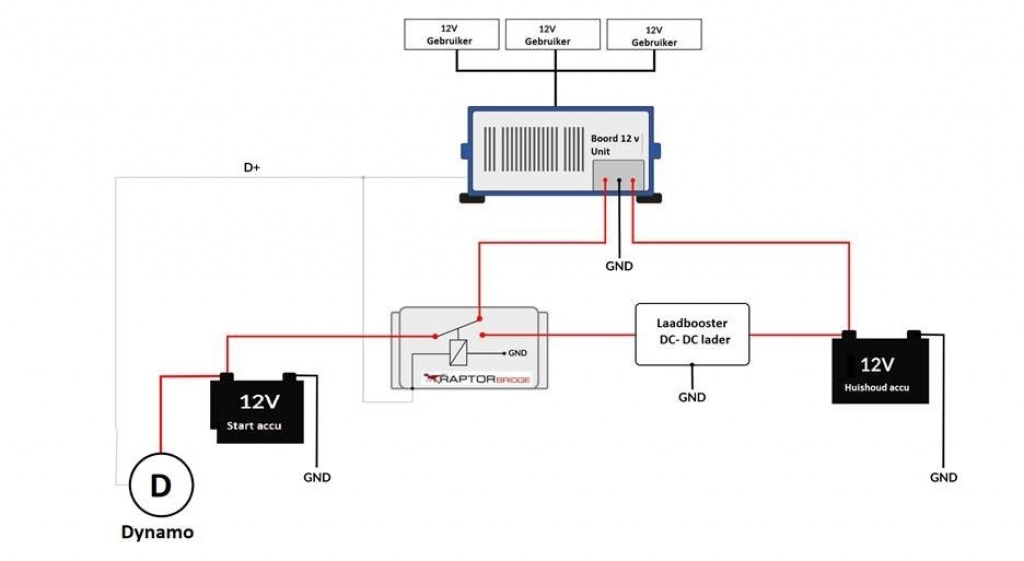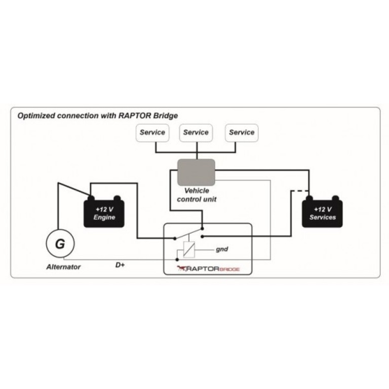 Raptor Bridge relais schakelaar voor elektroblok systeem. Automatische schakelaar die de dynamo loskoppelt van de EBL zodra de motor start. Wordt aangeraden bij het achteraf inbouwen van een laadbooster (DC/DC). De introductie van lithiumbatterijen in de camperwereld is een grote stap voorwaarts in energieopslag voor diensten. Er zijn veel kampeerders die hun voertuigen willen updaten door een lithiumbatterij te installeren, zowel op recent gebouwde voertuigen als op oudere voertuigen. Om maximale prestaties uit de lithiumbatterij te halen, moet ook het systeem van het voertuig worden aangepast. Dit is de reden waarom RAPTOR Bridge werd geboren , een alternatieve parallellator die het mogelijk maakt de verbinding tussen de motoraccu en de serviceaccu te optimaliseren, met vier fundamentele voordelen: • Creëert een vereenvoudigde en professionele parallelle verbinding tussen de serviceaccu en de motoraccu • Brengt de door de dynamo gegenereerde energie over op een speciale lijn, met uitzondering van de regeleenheid van de camper, waardoor deze wordt beschermd tegen mogelijke overbelasting • Indien geïnstalleerd met kabels van de juiste doorsnede , laat hogere stromen door, waardoor de oplaadtijden worden verkort door het spanningsverlies bij de accupolen te verminderen • Optimaliseert het werk van elke booster , zelfs in aanwezigheid van een slimme dynamo De montage van een raptorbrug heeft geen invloed op de garantie van het voertuig! Bij het opladen van de hulpaccu in de camper via de dynamo zijn meestal alleen lage laadstromen mogelijk, deze stromen namelijk via het elektroblok (EBL). De EBL heeft een kleine kabeldoorsnede, waardoor er geen hoge laadstromen zijn.Om optimaal gebruik te maken van de voordelen van moderne lithium LiFePO4-accu's - zeer hoge laadstromen en korte laadtijden - gebruiken we een laadbooster. Dit kan de EBL overbelasten. Om dit te voorkomen zijn aanzienlijke ingrepen in de voertuigelektronica nodig. Dankzij de RAPTOR Bridge is dit probleem verleden tijd! De RAPTOR Bridge is een automatische schakelaar die de dynamo loskoppelt van de EBL zodra de motor start. Tegelijkertijd zijn de laadbooster en de hulpaccu via een aparte kabel rechtstreeks op de dynamo aangesloten. Door deze aparte lijn wordt de EBL buiten het laadproces gelaten en loop je geen risico meer op overbelasting. De doorsnede van de afzonderlijke leiding kan dienovereenkomstig groot worden uitgevoerd om snel opladen met de maximale laadstroom mogelijk te maken. Bij het afzetten van de motor wordt de originele verbinding tussen de accu en EBL automatisch hersteld. De installatie van de RAPTOR Bridge is heel eenvoudig. Hij wordt eenvoudig in de positieve kabel tussen de startaccu en de EBL gestoken. Ingewikkelde wijzigingen aan de voertuigelektronica of de EBL, die een negatief effect hebben op de voertuiggarantie, kunnen achterwege blijven. Technische specificaties: -Werkspanning 12 Vdc ± 15% -Stroomverbruik 300 mA -Bedrijfstemperatuur -25°C +55°C -Maximale aansluitspanning 14 Vdc