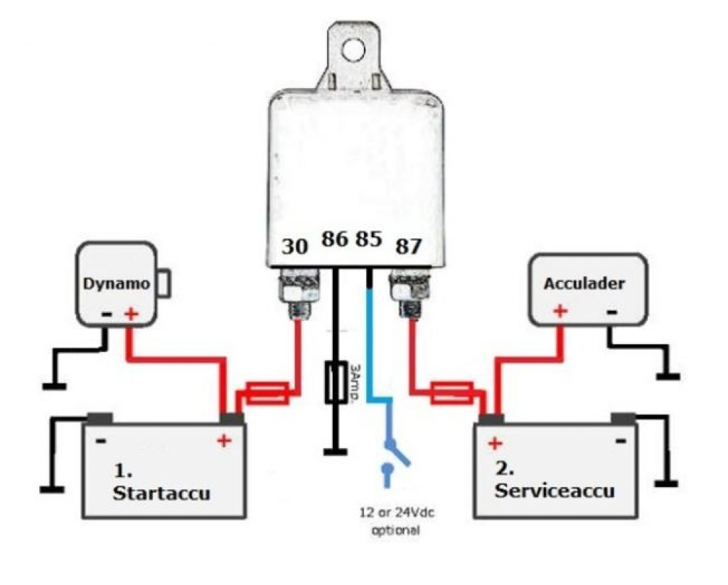 Dit scheidingsrelais is een ideale oplossing als men een tweetal accu's (of groepen) gelijktijdig wil opladen d.m.v. dynamo, acculader, zonnepanelen etc. Meestal van toepassing bij een startaccu en een verzorgingsaccu zoals bijvoorbeeld in campers, boten, servicewagens etc. De twee accu's komen onder bepaalde spanningsvoorwaarden parallel te staan. Alleen als de gemeten spanning van één van beide accu's voldoende hoog is, schakelt het relais in. Zakt de gezamenlijke spanning echter tot de ondergrens, dan zal het relais de verbinding weer verbreken. Door deze accubewakersfunctie kunnen de accu's elkaar dus niet ontladen.