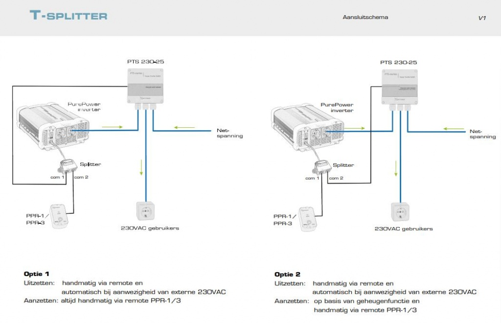 Alle PurePower en PurePowerPlus modellen vanaf 600Watt zijn voorzien van een 'remote' poort voor het aan/uit schakelen van de inverter op afstand. Wil men echter gebruik maken van de automatische aan/uit schakel functie (X-com) van de PTS 230-25 omschakelbox en daarnaast de inverter ook nog handmatig via de afstandsbediening (PPR-1/PPR-3) bedienen, dan is deze T-splitter nodig. Hiermee wordt de 'remote' opgesplitst naar twee uitgangen.