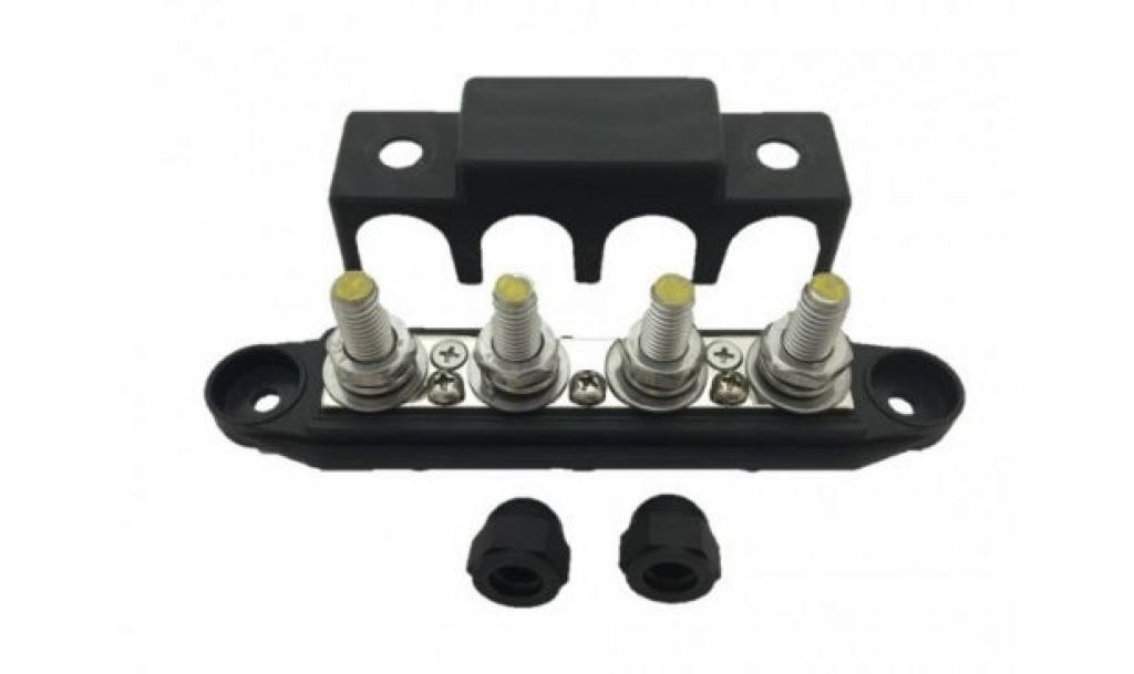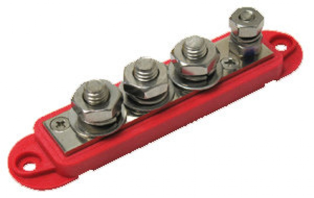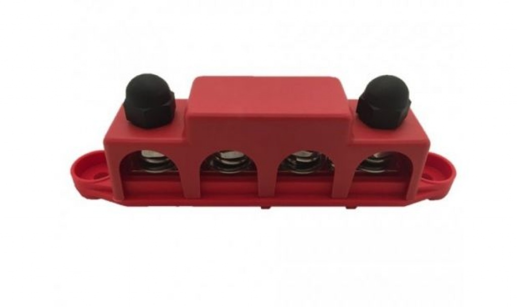 Verdeelstrip 4-voudig M8 met kap. Een verdeelstrip met 4 M8 bouten. Voor max 250A op 12 Volt. UL Rating 94 HB. Verkrijgbaar in het rood en zwart.