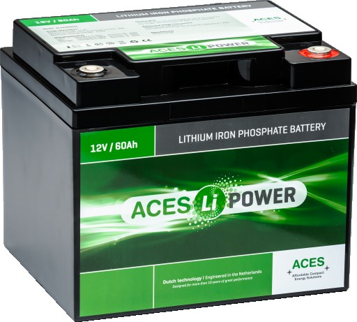Batterij 12V 60Ah ACES HFA LiFePO4 In kunststof ABS behuizing en M6 polen met Bluetooth.