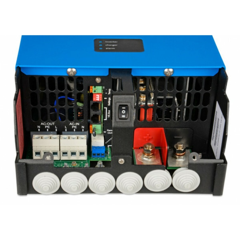 De MultiPlus 12/2000/80 is een combinatie van een krachtige zuivere sinusgolfomvormer met een vermogen van 2000 VA (1600 Watt), een geavanceerde acculader met adaptieve laadtechnologie van 80 Ampère, en een supersnelle AC-wisselschakelaar in een enkele compacte behuizing. Deze MultiPlus wordt geleverd zonder de benodigde 50mm² kabels.