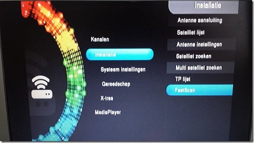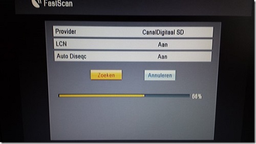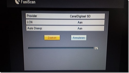 U bent nu in het Fastscan menu. Kies bij provider CanalDigitaal HD met d.m.v de pijl naar rechts. Ga daarna met de pijl naar beneden toets naar zoeken (dit wordt geel wanneer u er op staat) en druk op de OK-toets. Het zoeken wordt nu gestart en de voortgang wordt weergegeven met een percentage.