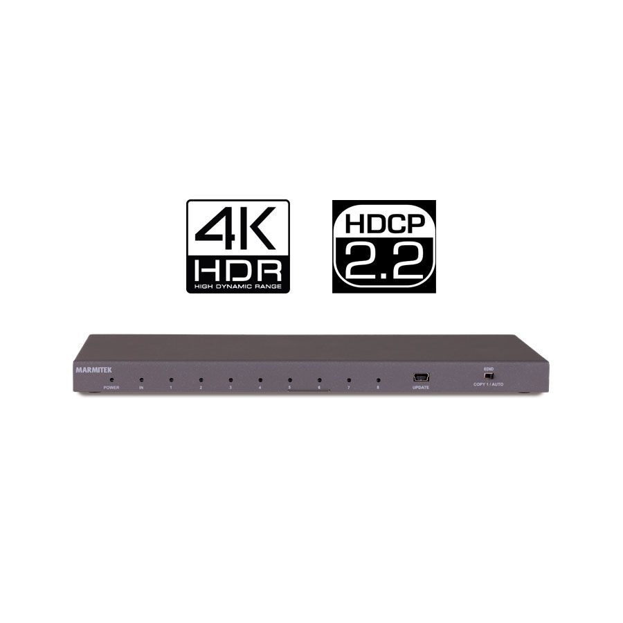 De Marmitek Split 618 UHD 2.0 heeft 1 ingang en 8 uitgangen. Hierdoor kunnen zeer gemakkelijk 8 schermen/TV’s voorzien worden van één HDMI bron. De splitter kan overweg met 4K60 resolutie met HDR, Deep color en 4:4:4 Chroma subsampeling.