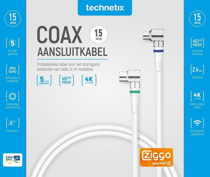 De Technetix RLA++21 is een professionele aansluitkabel voor het aansluiten van uw radio, tv of mediabox. Door de viervoudige afscherming is de kabel bestand tegen instraling van onder andere 4G/LTE signalen. De kabel is gemaakt met een maximaal frequentiebereik van 2400MHz, hiermee is het geschikt voor de toekomst. Deze kabel is de nieuwe standaard binnen Ziggo. De kabel beschikt over een IEC-Female en IEC-Male connectors.