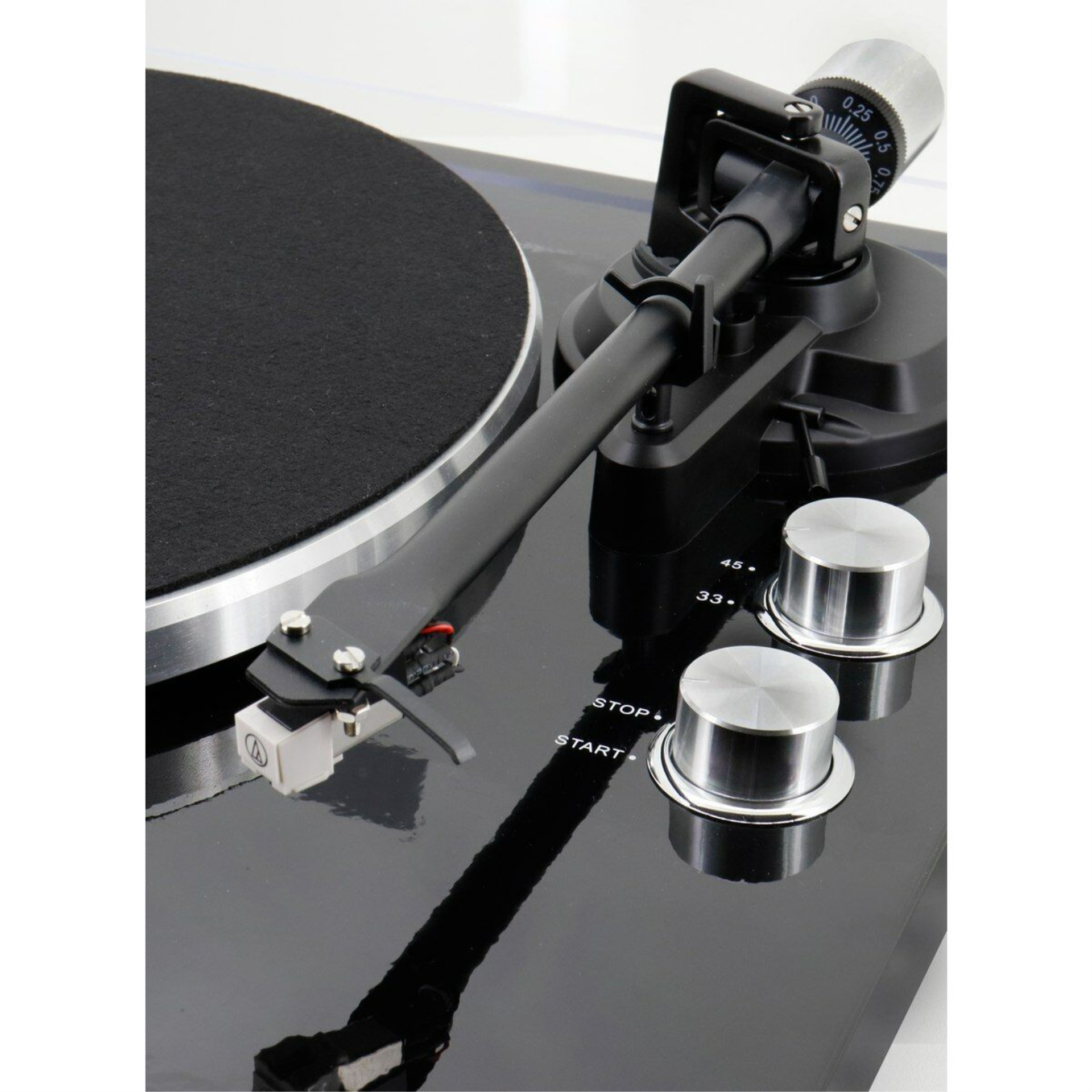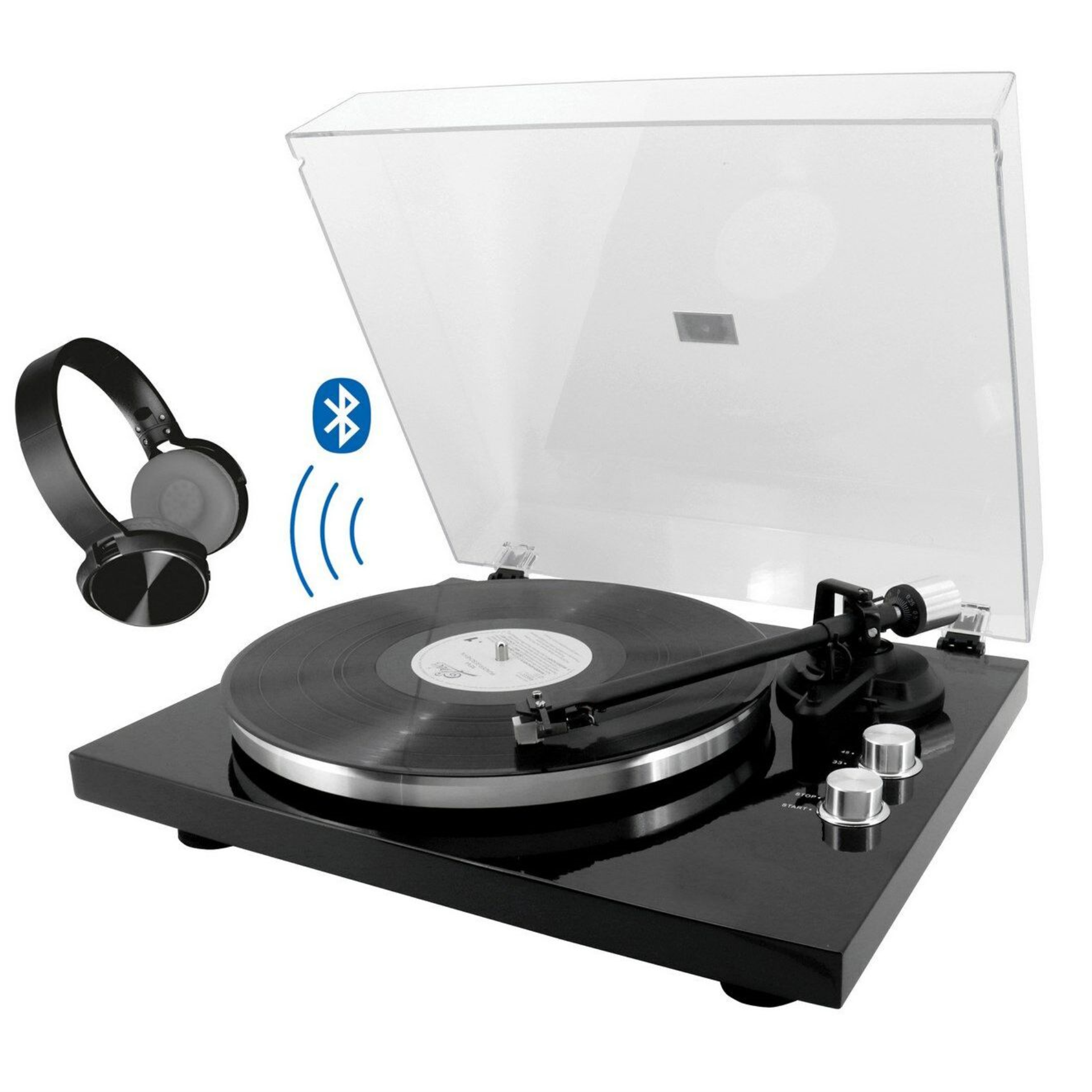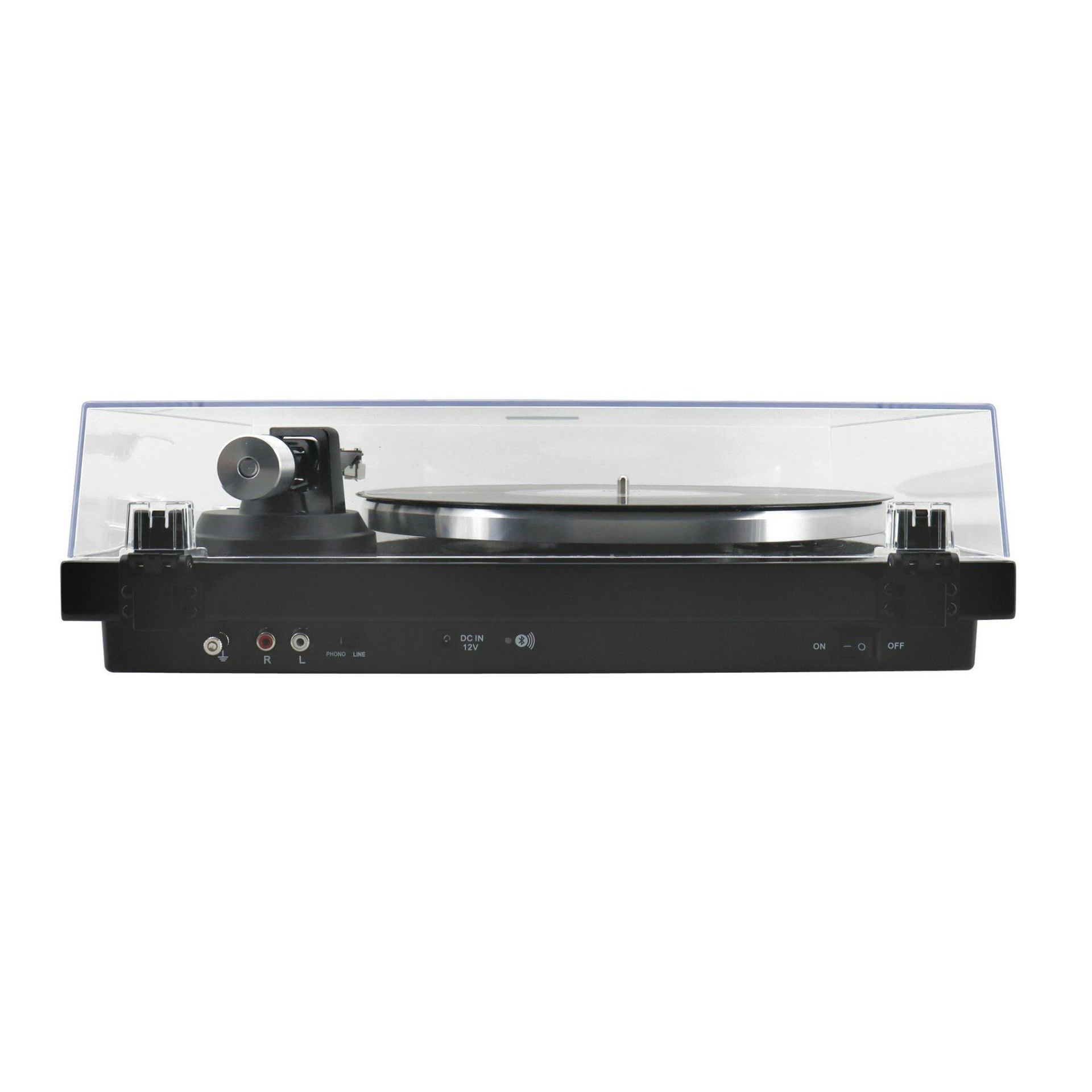 • Handmatig bedienbare platenspeler met twee afspeelstanden (33/45 RPM) • Verstelbaar contragewicht en toonarmlift • Antiskating-functie • Aluminium draaitafel voorzien van stofkap • De metalen behuizing zorgt voor stabiliteit en goede resonantie • Ingebouwde voorversterker (Phono/Line-Out-schakelaar) • Bluetooth • Meegeleverd: singeladapter en rubbermat • Voeding: AC/DC-adapter 12 V / 0,5 A