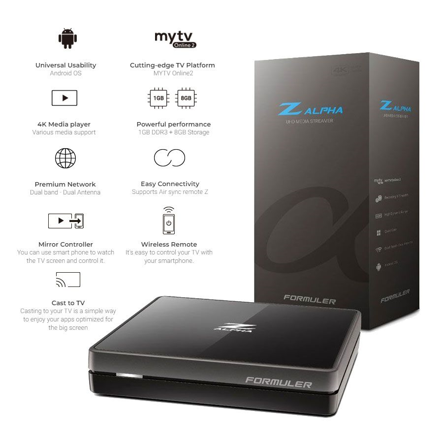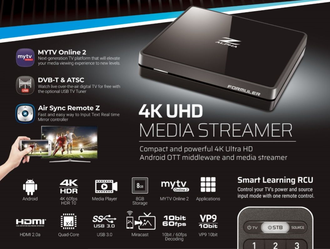 De Formuler Z Alpha is een 4K UHD HDR10 mediaspeler. Binnen in deze Formuler Z Alpha treffen we een quad core 64 bit Hisilicon processor aan met 1 GB DDR3 ram werkgeheugen en 8 GB eMMC opslaggeheugen. Dit alles zorgt ervoor dat de door Formuler aangepaste Android zeer vloeiend draait.