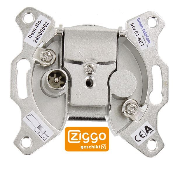 Eengats einddoos voor Ziggo gecombineerde radio/tv-aansluiting.