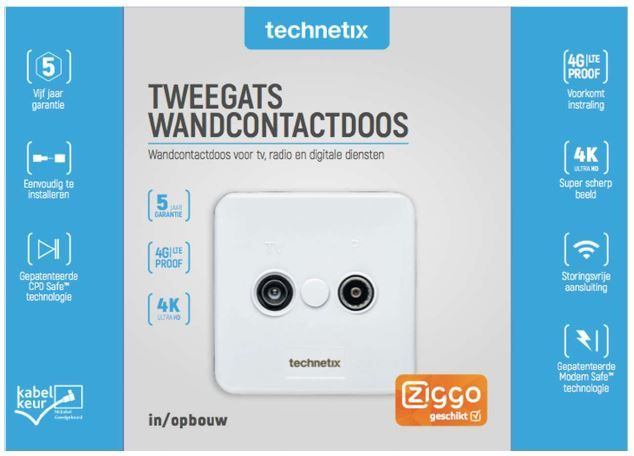 Deze Technetix TRAS-2000S is een hoogwaardige wandcontactdoos. Een wandcontactdoos monteert u in een kamer waarin u tv, radio of een mediabox wil aansluiten. Door de gepatenteerde modem safe en CPD Safe technologie bied deze wandcontactdoos een storingsvrijsignaal. Met deze TRAS-2000S bent u ook klaar voor de toekomst, het kan namelijk overweg met 4K UHD signaal. De wandcontactdoos is NIET geschikt als overnamepunt. U kunt twee kabels aansluiten op deze wandcontactdoos. De TRAS-200S is eenvoudig te monteren door middel van een schroevendraaier. Tevens is de wandcontactdoos gecertificeerd door KabelKeur.