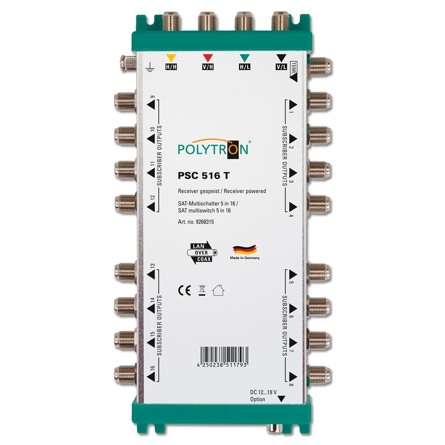 Polytron PSC 516 T multiswitch heeft 5 ingangen (4 x SAT, 1 x Terrestrisch) en 16 subscriber-uitgangen. Deze switch wordt gevoed door de ontvanger en transporteert het satellietsignaal naar max. 16 subscribers, zoals SAT-ontvangers, tv's met een satelliettuner etc.