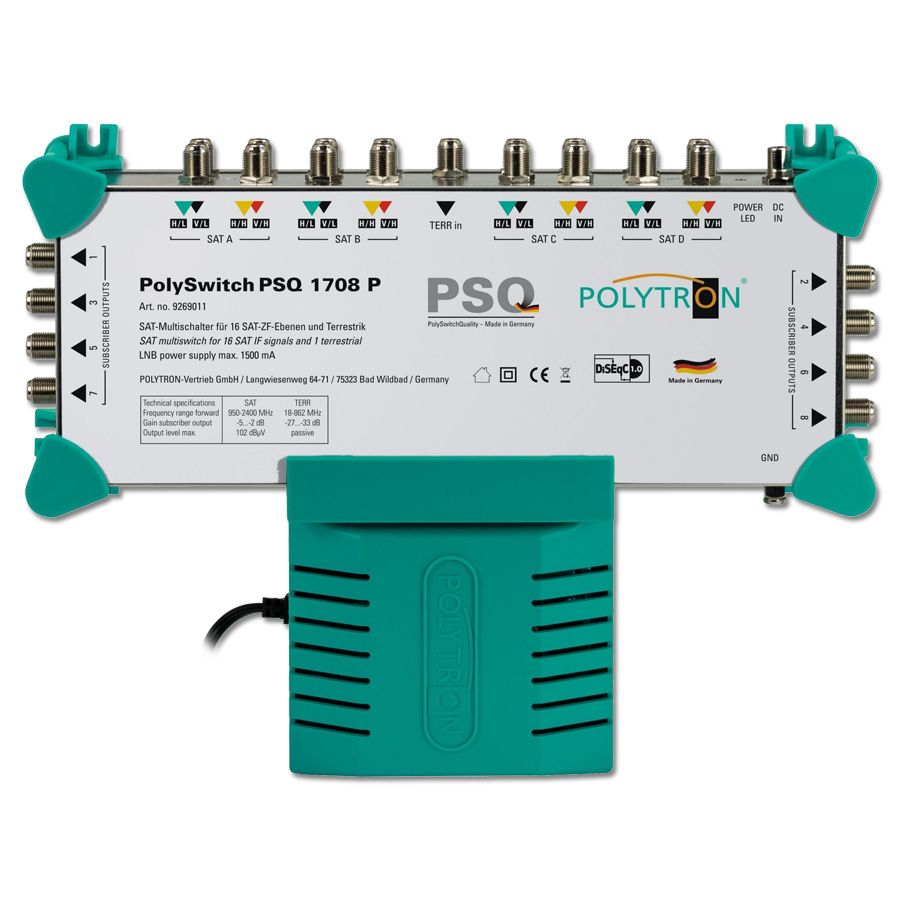 De Polytron PSQ 1708 P stand-alone multiswitch heeft 17 ingangen (16 x SAT en 1 x terrestrische TV input) en 8 uitgangen. Met deze multiswitch distribueert u 8 SAT polariteiten en 1 terrestrisch signaal. De PSQ 1708 P is voorzien van een ingebouwde voeding.