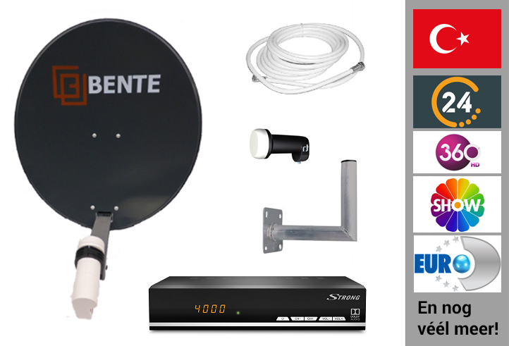 Wilt u de Turkse televisie- en radiozenders zonder abonnement kunnen bekijken? Dat kan met deze schotelset, de set is samengesteld voor ontvangst van de gratis te ontvangen Turkse televisiezenders.