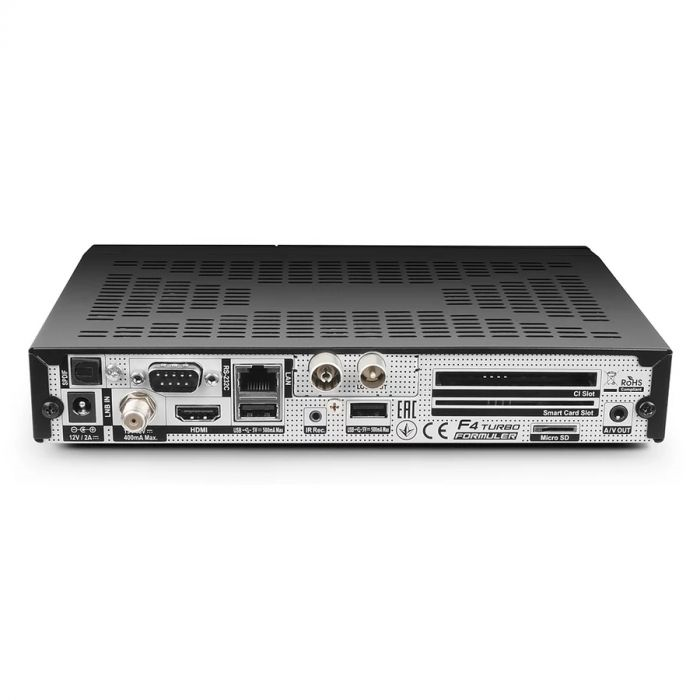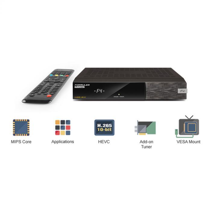 De Formuler F4 Turbo multimedia satellietontvanger heeft een krachtige Broadcom SoC processor onder de behuizing, net als 512 MB DDR3 werkgeheugen en een 256 MB flashgeheugen. Via de F4 Turbo geniet u van prachtige 1080p HD-beeldkwaliteit (H265 HEVC) en heeft u toegang tot talloze apps, zoals bijvoorbeeld Youtube en Uitzending Gemist. Achterop de Formuler F4 Turbo zit een smartcardreader en een CI-slot.